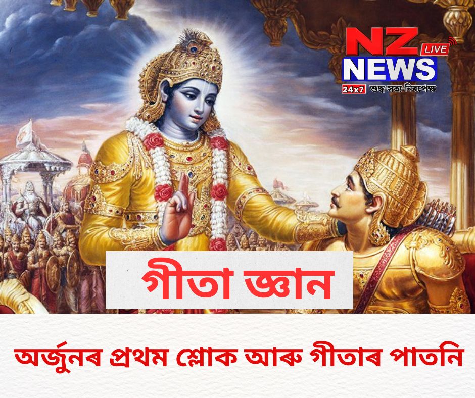ইয়াৰ লগে লগেই আৰম্ভ হ’ল গীতাৰ পাতনি। শ্ৰীকৃষ্ণই এটা এটাকৈ অৰ্জুনৰ প্ৰশ্নৰ উত্তৰ দি তেওঁৰ মনৰ ভ্ৰান্তি দূৰ কৰিলে। কৃষ্ণৰ যুক্তিত আত্মপ্ৰত্যয় মানি অৰ্জুনে হাতত গাণ্ডীৱ তুলি লৈ কৰ্তব্য পথত অগ্ৰসৰ হ’ল। সেয়ে আছিল অৰ্জুনৰ শেষ বচন অৰ্থ শেষৰটো শ্লোক।